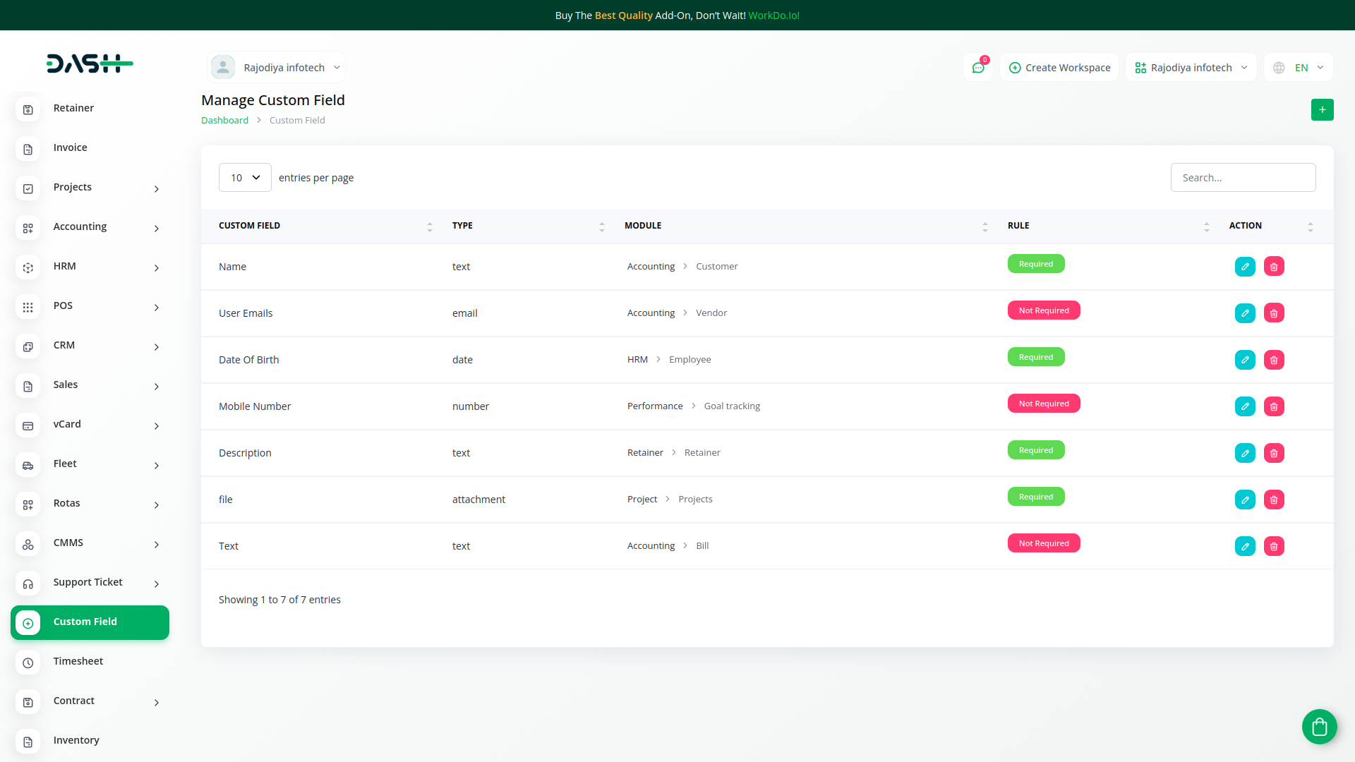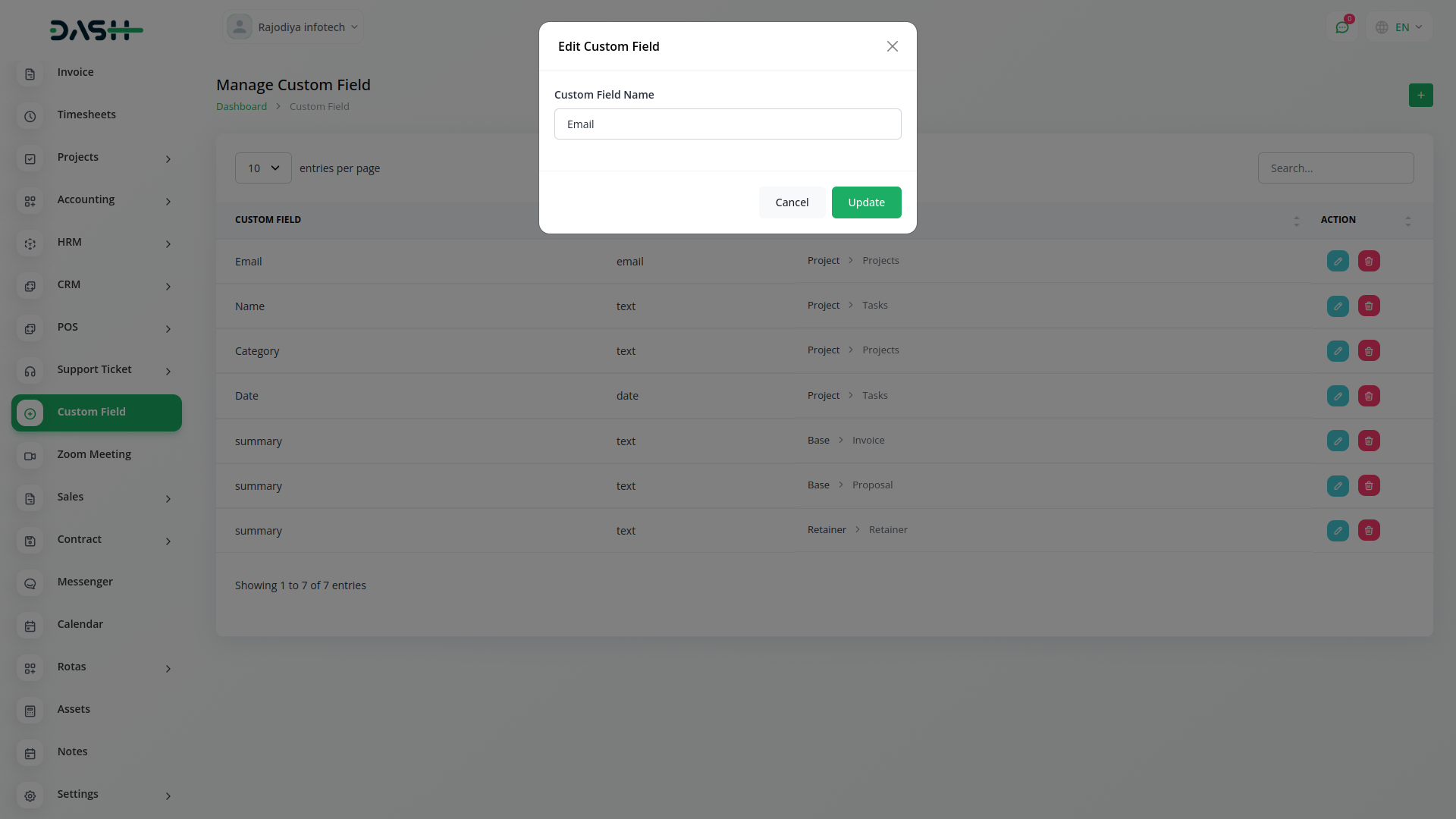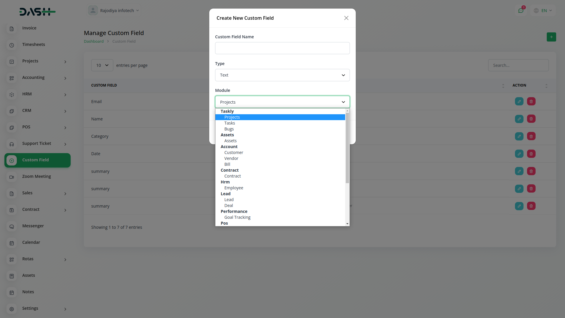 Custom Filed use in HRM, Account, Lead, Assests, Contract, Performance, Pos, Retainer, Sales, Taskly all modules.You can using custom filed collect additional information about all modules as you like.